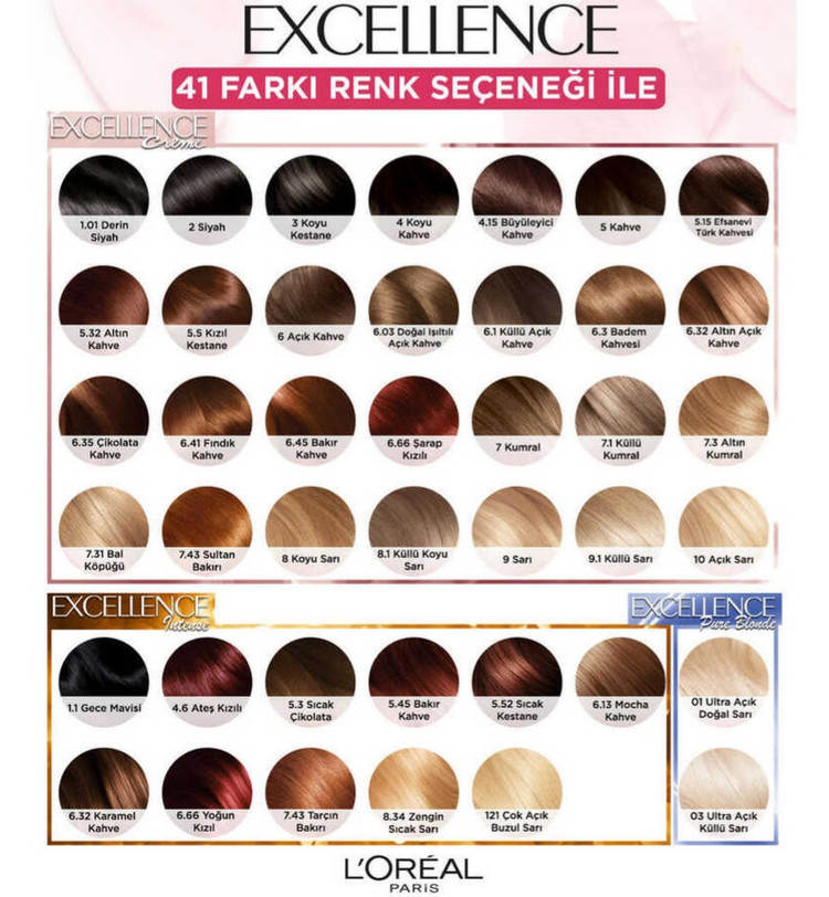 کاتالوگ رنگ موی لورآل اکسلانس شامل ۳ دسته اصلی و در مجموع ۴۱ رنگ متنوع است که طیف کاملی از رنگهای طبیعی تا تخصصی را پوشش میدهد. این سری با فرمول دائمی و پوششدهی کامل موهای سفید، انتخابی مطمئن برای مصرف خانگی و حرفهای محسوب میشود.